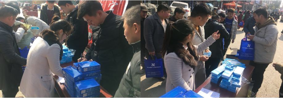 中众能县、镇、村三级招聘联络员分别在新村镇、张寨镇、柳沟镇、许堂乡等集镇市场设立中众能招聘宣传台,负责招聘咨询答疑,现场发放招聘宣传资料、印制的带有中众能介绍的扑克牌、纸杯、抽纸盒、挂历、手提袋等宣传礼品,收到良好的社会和经济效益。图为中众能联络员发放宣传礼品场景。